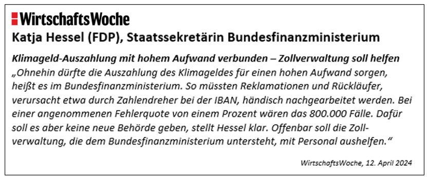 [1] Wirtschaftswoche (12. April 2024): „Bundesfinanzministerium kann 2025 das Klimageld auszahlen„, Berlin.