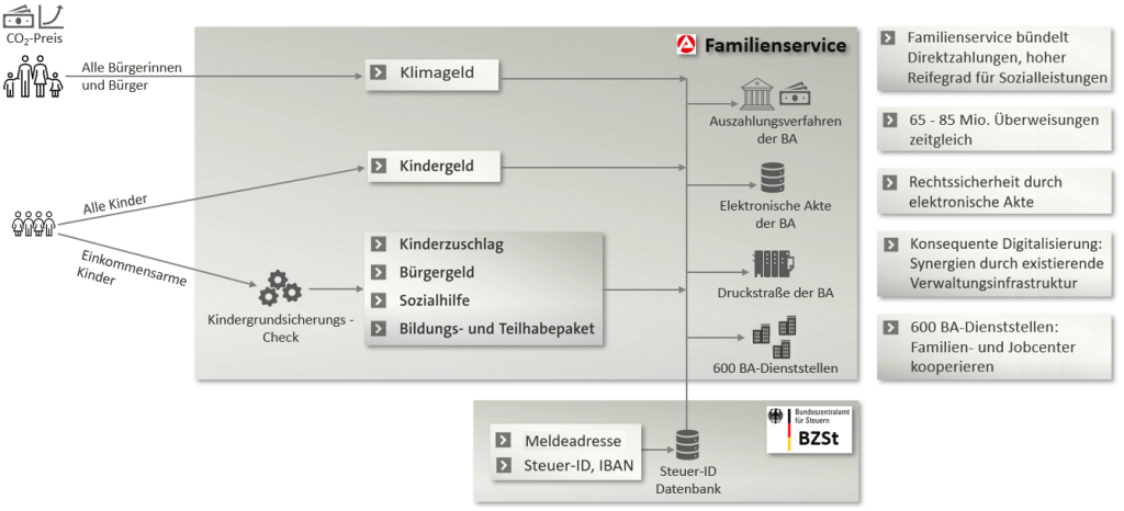 Zusammenarbeit BZSt und Familienservice Es ist sinnvoller, das BZSt rein für die Datenhaltung und den Familienservice der BA für das Massengeschäft und die Verwaltung einzusetzen. Die BA betreibt 600 Dienststellen: Familienkassen und Jobcenter. Bei einem gemeinsamen IT-System können beide im Klimageld beraten und die Aufgaben sinnvoll untereinander aufteilen. Die derzeitige politische Diskussion um die Kindergrundsicherung darf nicht davon ablenken, dass der Familienservice die zusätzlichen Aufgaben bewältigen kann. Kindergeld- und Klimageldzahlungen sind technisch kaum zu unterscheiden und unterliegen den gleichen Regeln. Beide erfordern keine komplizierten Anträge oder Einkommensprüfungen. Beide können unabhängig vom Kindergrundsicherungs-Check erfolgen. Nur dort liegt die aktuelle Herausforderung der Kindergrundsicherung. Deshalb ist eine effiziente Integration des Klimageldes in die bestehende IT-Infrastruktur der Kindergeldzahlungen machbar und sinnvoll.[4]