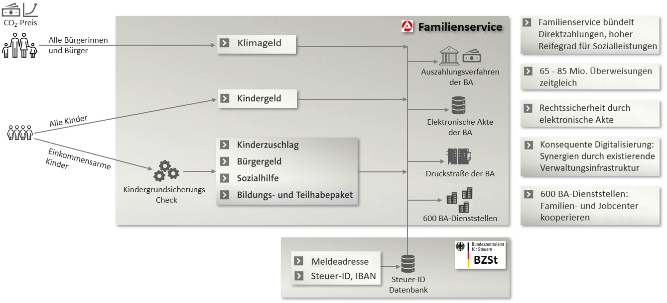 Arbeiten Familienkasse und BZSt zusammen, wird Mitte 2023 das Klimageld ausgezahlt. Direkter Auszahlungsweg an alle Bürger:innen: Es wird dringend ein direkter Auszahlungsweg an alle Bürger:innen benötigt, um in Zeiten hoher Energiepreise sowohl gezielt Entlastungen zu schaffen, als auch mit einem Klimageld CO2-Preise sozial auszugleichen. [1] Familienkasse übernimmt Datenerfassung und Massengeschäft: Die Familienkasse BA stellt ihre„Familienkasse zahlt Klimageld aus“ weiterlesen